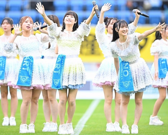 『HKT48』の来場に、会場も盛り上がりを見せた。なお、ハーフタイムには、ピッチ内にてスタジアム大抽選会も実施されるようだ。