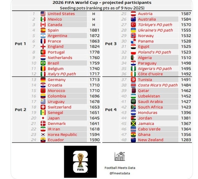 FIFAランキングを基に、北中米ワールドカップの組み分けで用いられるポット分けに、一部変更が生じる可能性があるという。海外のデータサイト『Football Meets Data』が次のように伝えている。