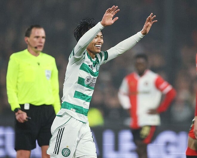 前田大然、旗手怜央、山田新、稲村隼翔が所属するセルティックは現地11月27日に開催されたヨーロッパリーグ(EL)のリーグフェーズ第5節で、上田綺世と渡辺剛を擁するフェイエノールトと対戦。3-1で逆転勝利を飾った。