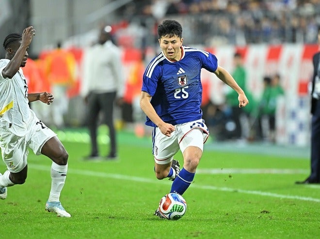 日本はポゼッション中の単純なミスが多く、カウンターを食らう場面も散見されたものの、試合の大筋ではガーナのプレスをうまく剥がした。また、アサンテとスレマナは、中盤の守備にほとんど下がらなかったので、ガーナのボランチの両脇は常にがら空き。日本は久保らを経由しながら、スムーズに攻め込むことができた。
