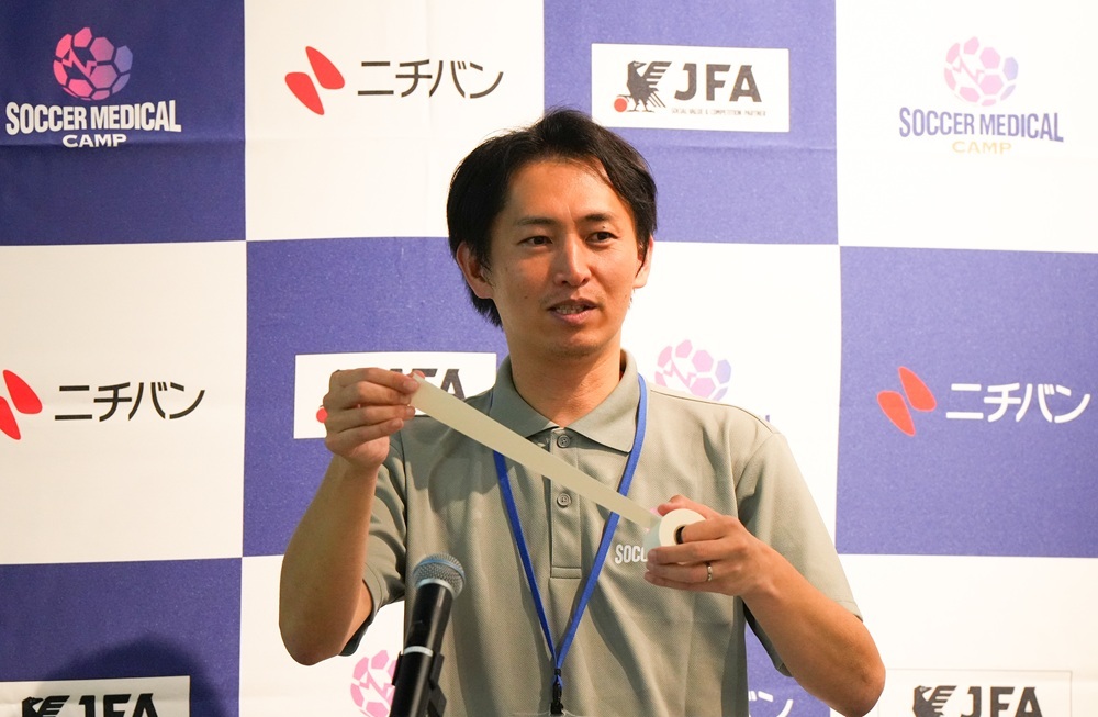 ニチバン株式会社の中村マネジャーは、テーピング「バトルウィン」の開発で、粘着力の向上や蒸れにくさの改良に加え、テーピングを巻くトレーナーと、巻かれる選手との要求の違いなど、様々なジレンマを乗り越えて試作を重ねたという秘話を紹介しました。