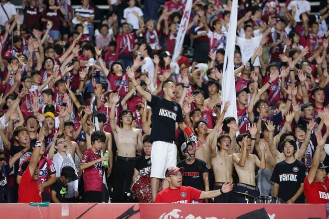 【岡山0-0札幌】ファジアーノ岡山のサポーター。写真:茂木あきら(サッカーダイジェスト写真部)