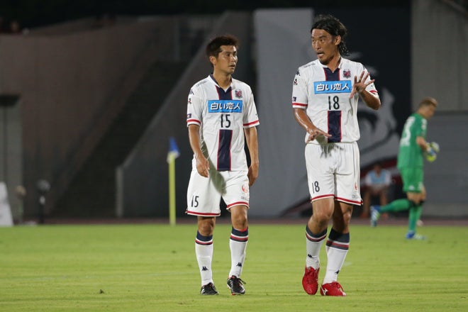 【岡山0-0札幌】戦術の確認をする菊地(15番)と増川。写真:茂木あきら(サッカーダイジェスト写真部)