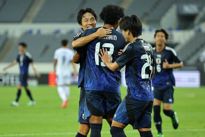 【厳選ショット】ジャーメイン良と喜びを分かち合う稲垣祥|写真:梅月智史(サッカーダイジェスト写真部/現地特派)