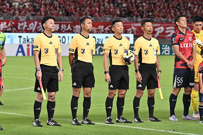 【画像】唐紙学志副審、堀越雅弘第4の審判員、池内明彦主審(左から)と共に鹿島のピッチで試合を裁く!|写真:鈴木颯太朗