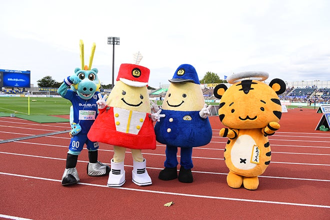 【J2第32節PHOTO】秋田0-0大分|試合前、マスコットが周回に登場!(左から/ブラウブリッツ秋田「ブラウゴン」・秋田県警察 「あいちゃん」と「まもるくん」・秋田県トラック協会 「とらっくん」)|写真:鈴木颯太朗