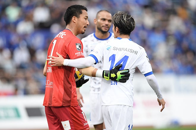 【J2第32節PHOTO】秋田0-0大分|ゴール前で接触があり、一触即発の場面があったがすぐに和解した、山田元気(左)と、池田廉(右)|写真:鈴木颯太朗
