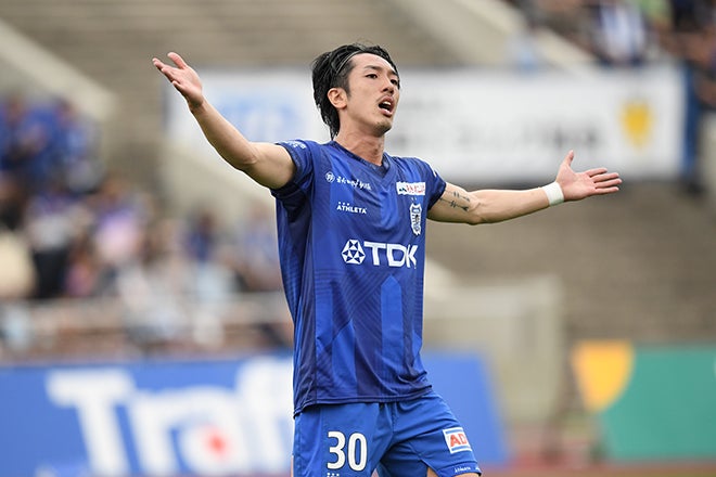 【画像】際どい判定に抗議する飯泉涼矢。|写真:鈴木颯太朗