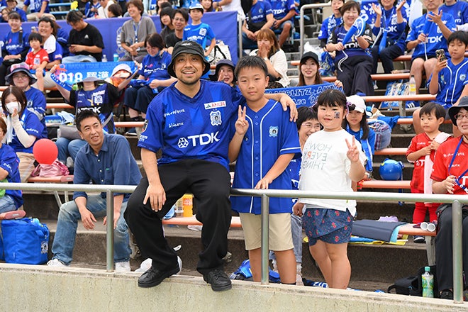 【画像】サポーターと記念撮影!羅漢さんがハーフタイムを盛り上げた!|写真:鈴木颯太朗