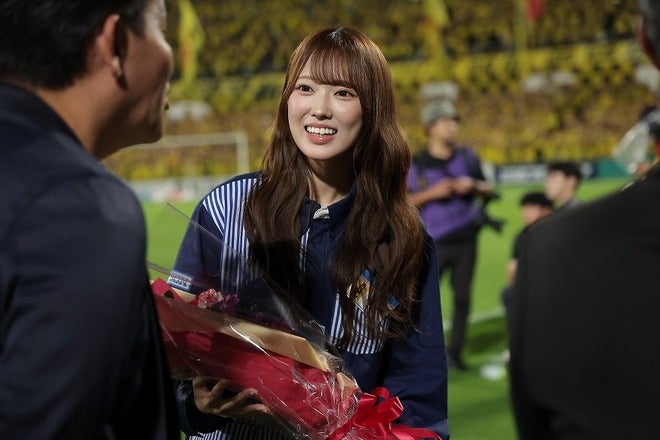 人気アイドル『日向坂46』の清水理央さんがレイソル本拠地に来場! 試合前には花束贈呈やキックオフセレモニーも