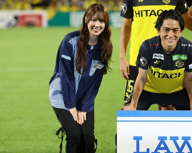 人気アイドル『日向坂46』の清水理央さんがレイソル本拠地に来場! 試合前には花束贈呈やキックオフセレモニーも