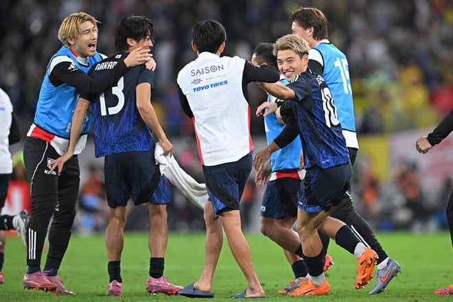 【画像】試合終了!ベンチのメンバーもピッチになだれ込み勝利を分かち合った|写真:金子拓弥(サッカーダイジェスト写真部)