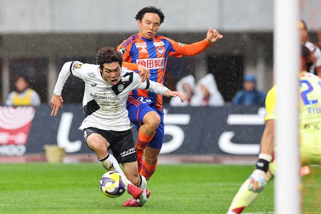 【PHOTO】後半立ち上がり、宮代大聖がエリア内で倒されPKを獲得|写真:梅月智史(サッカーダイジェスト写真部)