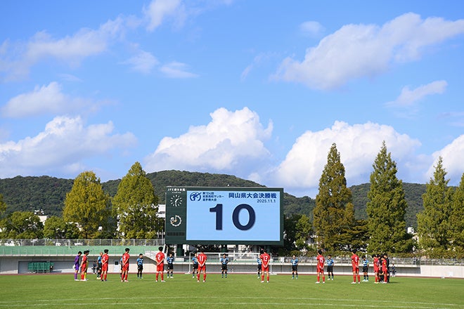 【選手権岡山県予選決勝PHOTO】岡山学芸館1-0就実|9月6日に、総社高校サッカー部監督兼岡山県サッカー協会2種委員長を務めた黒川竜生 氏が事故によりご逝去されたことを受け、黙祷が捧げられた。|写真:鈴木颯太朗