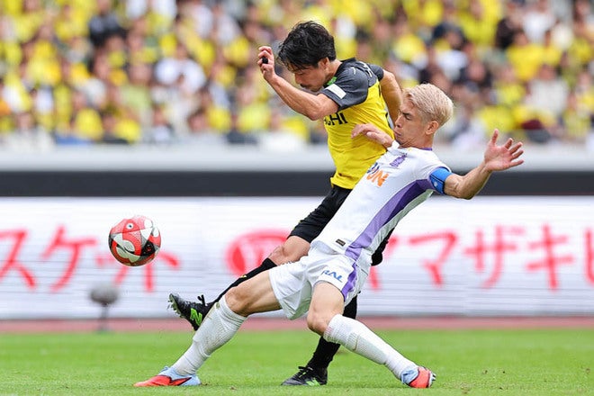 【厳選ショット】仲間隼斗のシュートをブロックする佐々木翔(右)|写真:梅月智史(サッカーダイジェスト写真部)