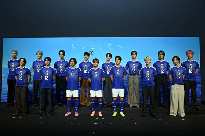 【画像】日本代表公式アンバサダーを務めるJO1とINIの選抜メンバーとの記念撮影|写真:金子拓弥(サッカーダイジェスト写真部)