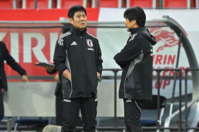 【画像】森保一監督(左)、名波浩コーチ|写真:金子拓弥(サッカーダイジェスト写真部)