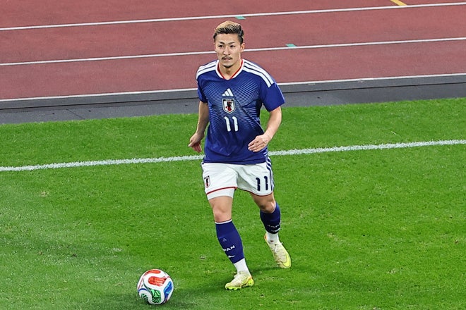 前田大然(82分OUT):採点6.5|クロスの精度には課題を残したが、果敢な仕掛けと持ち味の猛プレスで好印象を残す。写真:梅月智史(サッカーダイジェスト写真部)