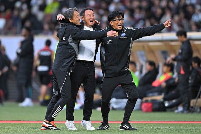 【厳選ショット】試合終了!喜ぶ黒田剛監督|写真:金子拓弥(サッカーダイジェスト写真部)