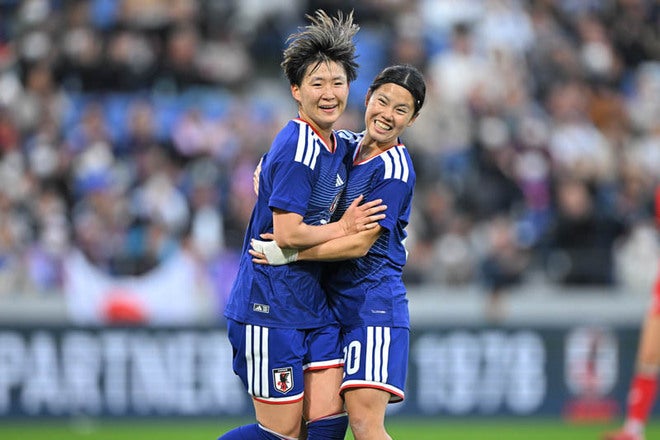 【画像】藤野あおば(左)がゴールを奪い、日本が3点リード!|写真:金子拓弥(サッカーダイジェスト写真部)