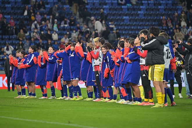 【画像】サポーターに挨拶するなでしこジャパン|写真:金子拓弥(サッカーダイジェスト写真部)