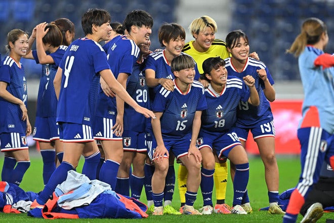 【画像】試合後に記念撮影するなでしこジャパン|写真:金子拓弥(サッカーダイジェスト写真部)