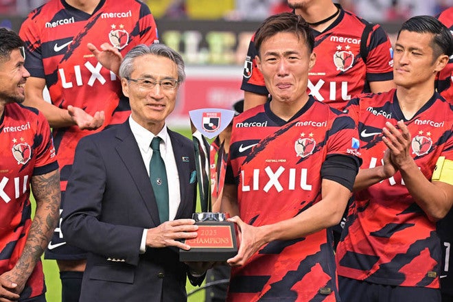 【画像】表彰式で涙ぐむ三竿健斗|写真:金子拓弥(サッカーダイジェスト写真部)