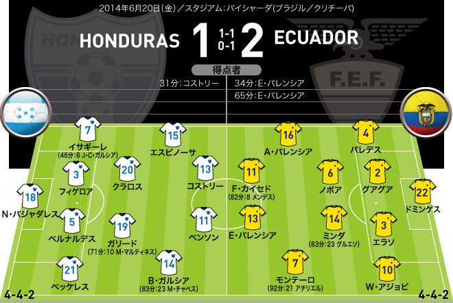 ホンジュラス(4-4-2) 1-2 エクアドル(4-4-2)