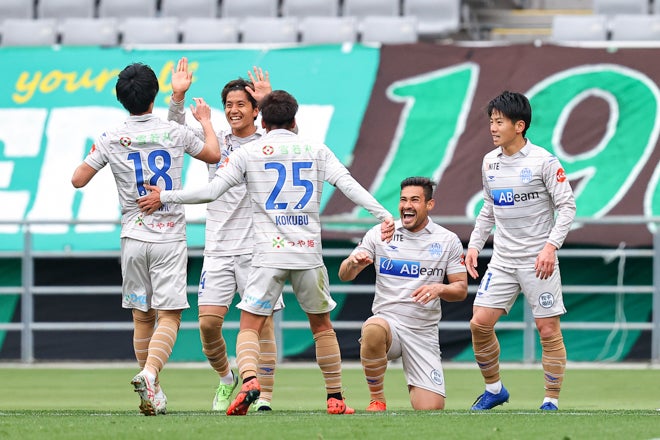 【J2第2節PHOTO】東京V0-2山形|ヴィニシウス・アラウージョ(右から2番目)の追加点に喜ぶ山形の選手たち。|写真:塚本凜平(サッカーダイジェスト写真部)
